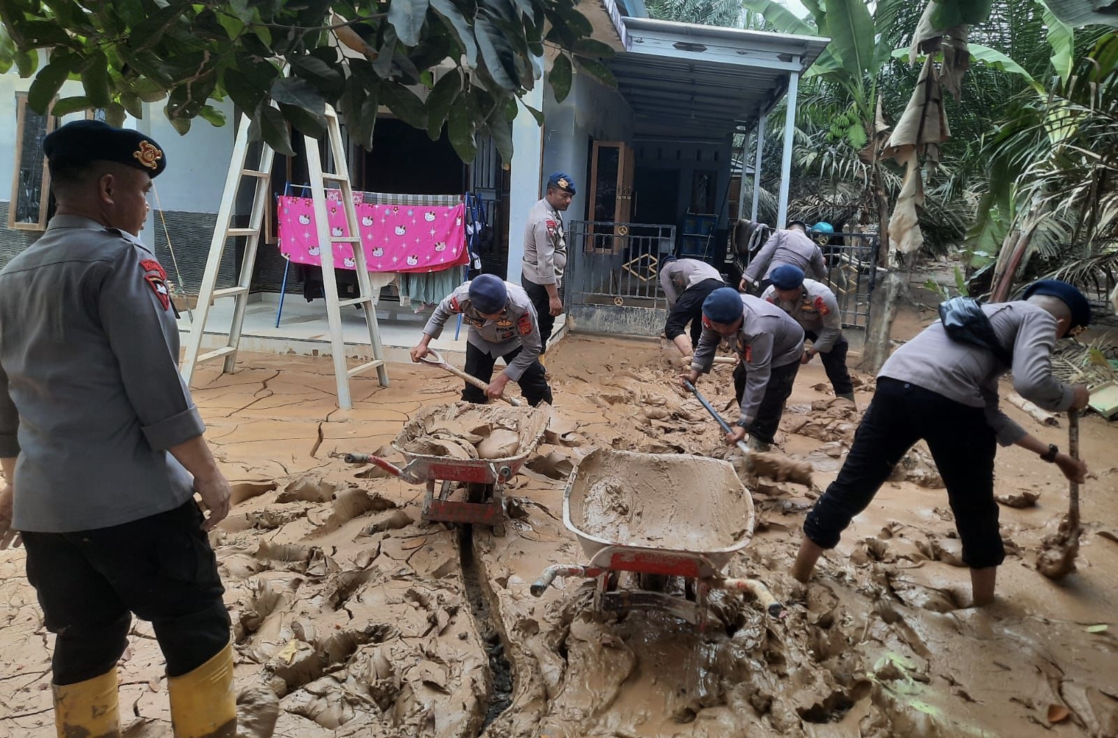 Dipimpin Danki 4 Batalyon B Pelopor Iptu Apriandy, S.H, puluhan pasukan Brimob turut membantu warga membersihkan rumah serta fasilitas sekolah yang terdampak banjir.