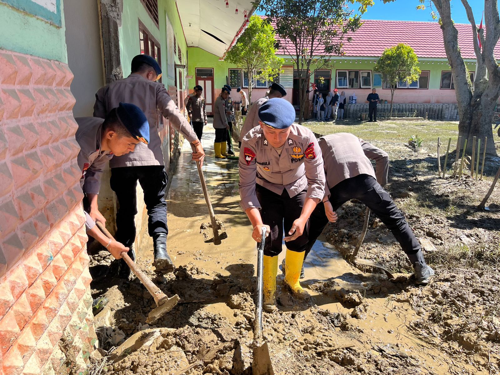 Pasca banjir di beberapa titik yang ada di Kabupaten Kerinci, Satuan Brimob Polda Jambi Kompi 3 Batalyon B Pelopor diterjunkan untuk membantu membersihkan fasilitas sekolah di SD Negeri 109 Lubuk Suli, Senin (01/12/2025).