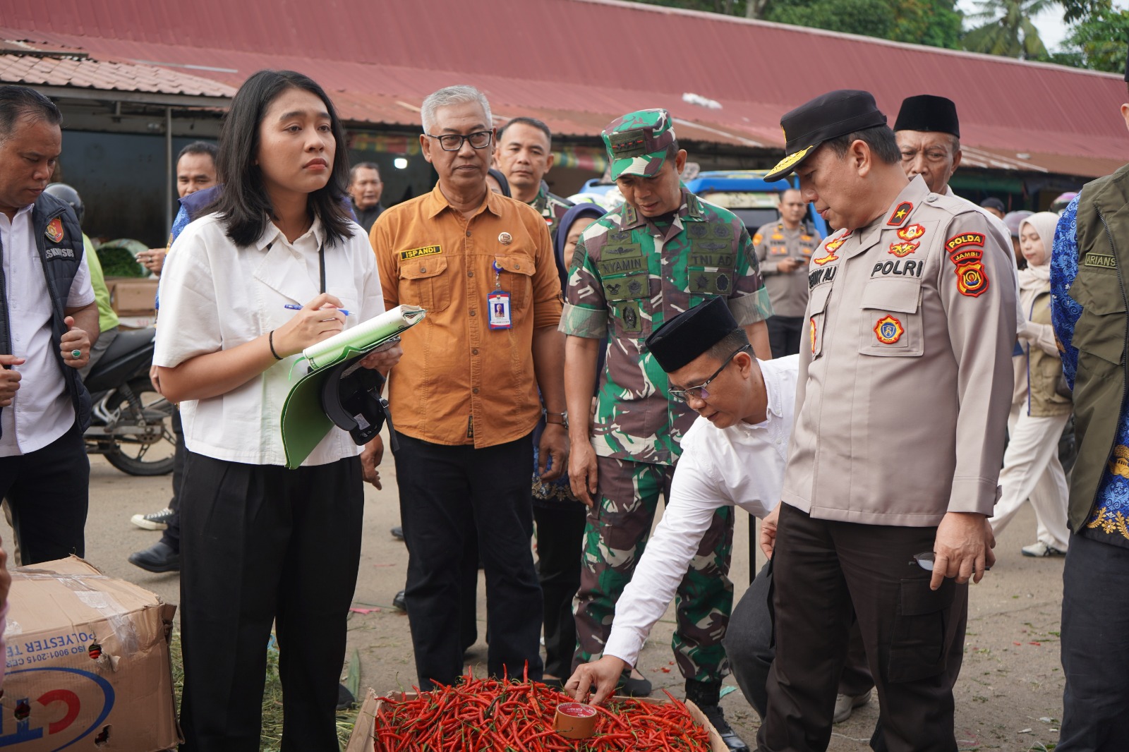 Dalam peninjauan itu, rombongan berdialog langsung dengan para pedagang dan pembeli guna memastikan stok beras, gula, minyak goreng, telur, daging, cabai, dan komoditas strategis lainnya tersedia dalam jumlah cukup serta harga tetap stabil.