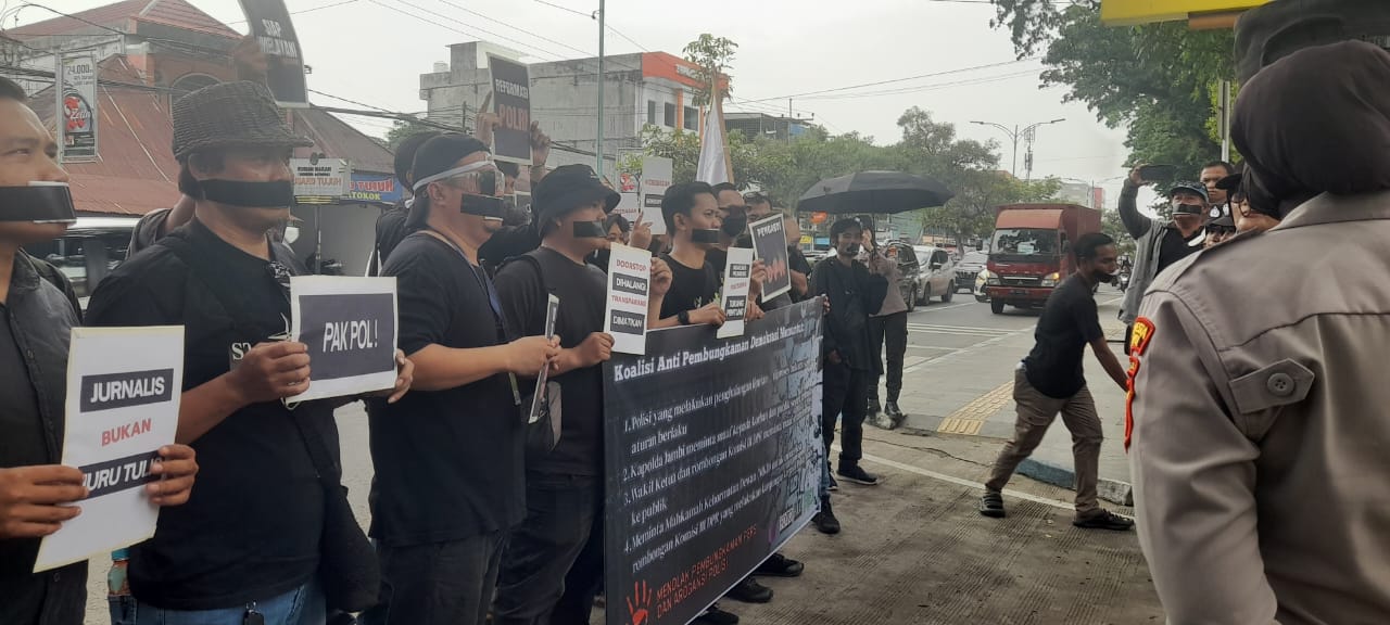 Puluhan wartawan lokal dan nasional yang tergabung dalam Koalisi Anti Pembungkaman Demokrasi kompak berdiri serba hitam, mulut dilakban hitam, seolah-olah suara mereka benar-benar dibungkam.