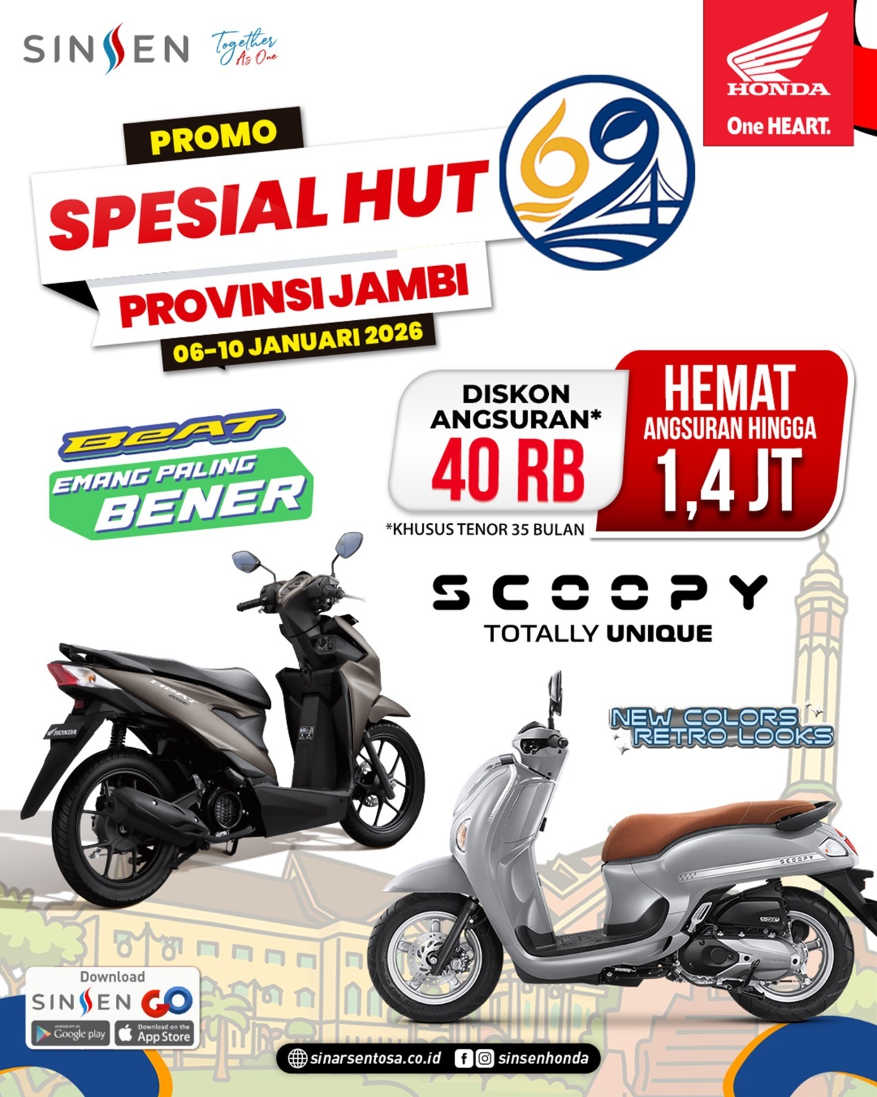 Promo ini berlaku selama 6 hingga 10 Januari 2026 dan khusus ditujukan untuk pembelian Honda BeAT series dan Honda Scoopy series di seluruh jaringan dealer resmi Honda Sinsen wilayah Jambi.
