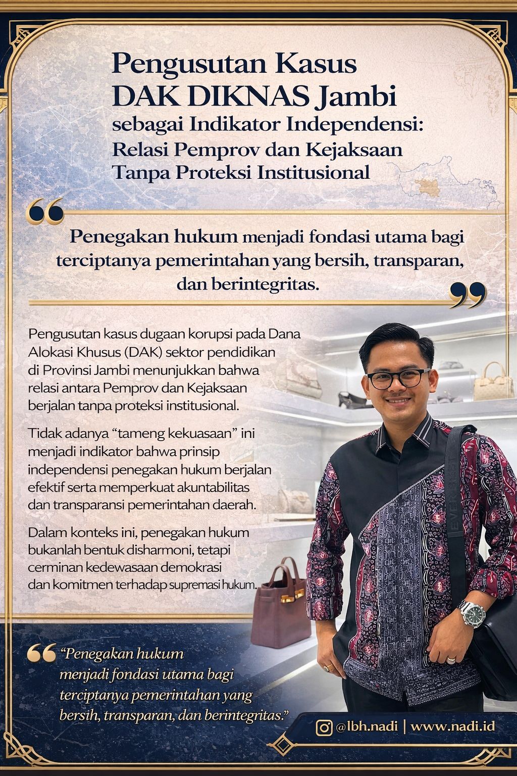 JAMBI, netinfo.id – Pengusutan dugaan tindak pidana korupsi pada Dana Alokasi Khusus (DAK) sektor pendidikan di Provinsi Jambi merupakan peristiwa hukum yang tidak hanya relevan dalam konteks penegakan hukum semata,