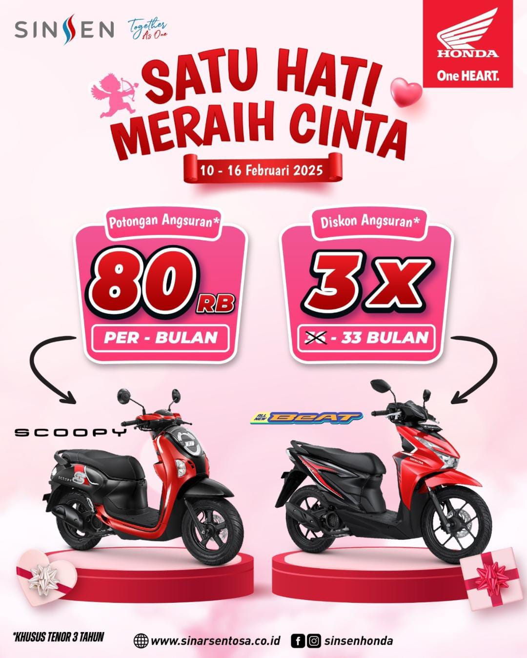 Program ini meliputi potongan angsuran sebesar Rp 80 Ribu per bulan untuk pembelian New Honda Scoopy, serta diskon angsuran selama 3 bulan khusus pembelian Honda BeAT. Kedua promo ini berlaku untuk tenor 3 tahun, dengan syarat dan ketentuan yang berlaku.