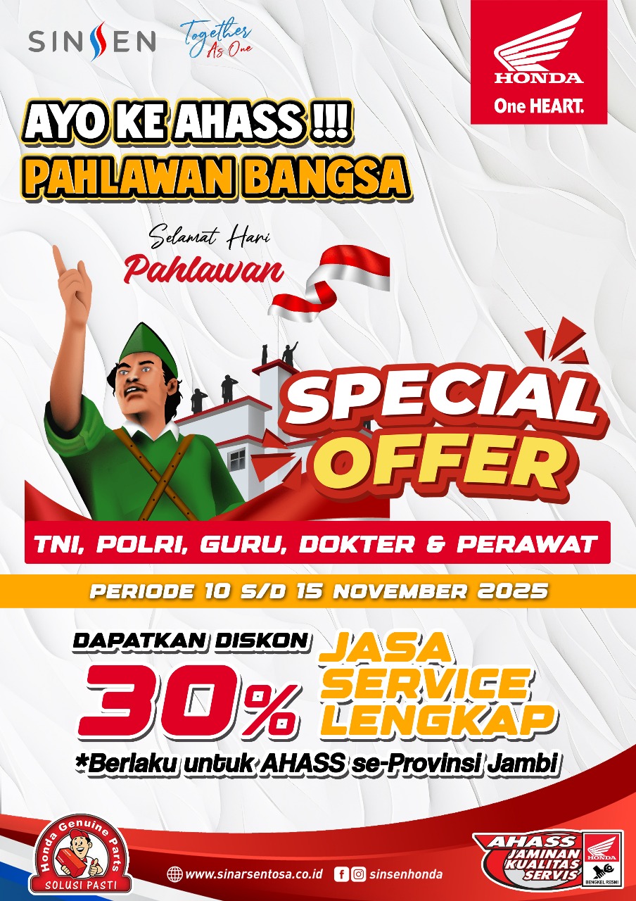 Jambi, netinfo.id – Dalam semangat memperingati Hari Pahlawan Nasional yang jatuh setiap 10 November, PT Sinar Sentosa Primatama (Sinsen), Main Dealer sepeda motor Honda di Provinsi Jambi, memberikan apresiasi spesial untuk para pahlawan masa kini lewat program bertajuk “Special Offer Hari Pahlawan”.
