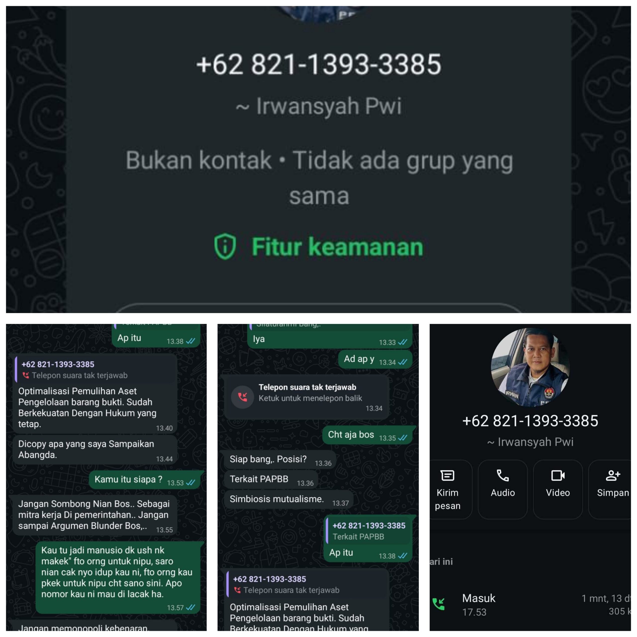 Berdasarkan tangkapan layar percakapan yang beredar, pelaku menggunakan foto profil Irwansyah serta nomor WhatsApp +62 821-1393-3385, dan menyisipkan istilah-istilah yang berkaitan dengan urusan pemerintahan serta pengelolaan aset guna menimbulkan kesan resmi dan terpercaya.